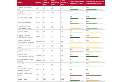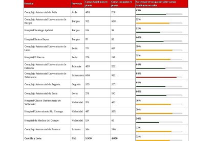 A la cabeza del ranking también se sitúan el Complejo Asistencial de Zamora (con 280 plazas ocupadas de 364 –un 77%–), el Clínico de Valladolid (con 432 ocupadas de 571 –un 76%–) y el hospital del Bierzo (con 193 camas ocupadas de 258 totales –un 75%–), según los datos facilitados y que se actualizan a diario.
