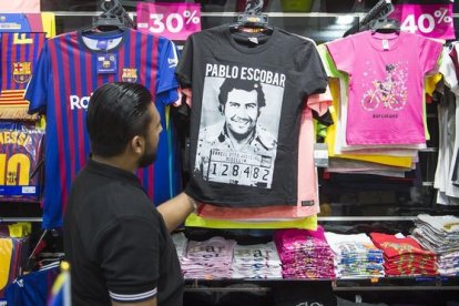 "Se produce un tránsito del icono popular, que es lo que Escobar es en Colombia, al icono pop, que es en lo que lo convirtieron los gringos y los europeos –dice el crítico de televisión, profesor de la Universidad de los Andes de Bogotá y responsable del proyecto ‘Narcoestéticas’ Omar Rincón–. O dicho de otro modo, hay dos adoraciones. Aquí lo adora un sector de la sociedad porque es un hombre pobre y sin estudios, sin conexiones, sin poder, que surge de la nada y derrota a los oligarcas y al Estado, pero a los europeos y los estadounidenses eso no les dice nada, ellos se lo apropian como un icono pop". Barcelona, como cualquier otra ciudad turística europea, produce señales que indican que está en esa longitud de onda: en las tiendas de suvenires de la Rambla, junto a las camisetas del equipo de la ciudad o las del dragón del parque Güell es fácil encontrar las que están estampadas con la famosa foto de la ficha policial del narco colombiano. Sale joven, sonriente, guapo de una manera latinoamericana, investido con esa maldad atractiva que produce sonreír sobre la combinación numérica del apresado.