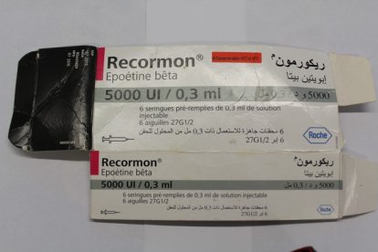 1. Recormon. Es el nombre con el que comercializa la hormona de la eritoproyetina, más conocida como EPO, el laboratorio Roche. Se trata de unos inyectables que deben ser guardados preferentemente en la nevera, de lo contrario se pueden estropear y causar serios problemas en su administración. Se han dado casos de intoxicaciones graves de deportistas por inyectarse EPO en mal estado. En este caso, tal como se refleja en la fotografía, se trata de una caja de seis jeringuillas de 0,3 miligramos comprada en Marruecos ya que las explicaciones aparecen tanto en francés como en árabe, lenguas oficiales del país de origen de FIFA.