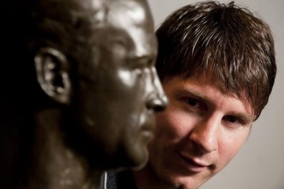 Leo Messi mira el busto del goleador César Rodríguez al que superó, con solo 24 años, al lograr un triplete, que le colocó en 234 goles como azulgrana, dos más (232) de la marca del 'Pelucas'. / JORDI COTRINA