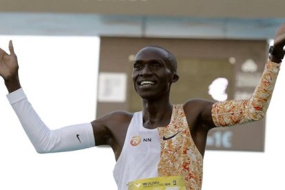 Cheptegei, en Valencia tras batir el récord de 10.000 m. / JUAN CARLOS CÁRDENAS (EFE)