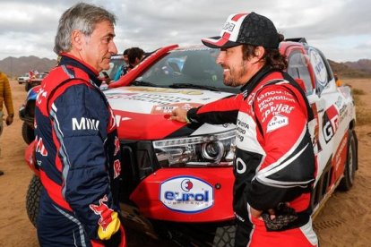 Carlos Sainz y Fernando Alonso, grandes amigos, conversan al acabar hoy el Dakar. / DPPI / FREDERIC LE FLOC