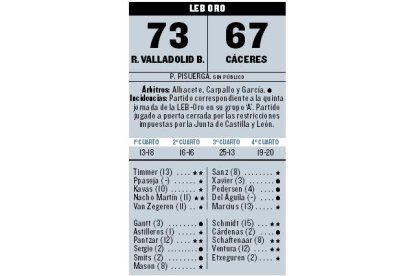 Esa falta de ambiente y ese frío en Pisuerga pareció dejar hibernando al conjunto de Hugo López en una primera mitad de poco brillo y oficio. Su falta de acierto en el lanzamiento (11 de 28 en tiros de campo) le llevó a luchar con escopetas de feria ante un rival sin grandes jugadores pero tremendamente serio que mandó en el marcador sacando provecho de los desajustes defensivos en los bloqueos, una situación que no es nueva esta temporada en los vallisoletanos. Cáceres, sin grandes alardes, mandaba en el marcador en un partido frío con ventajas que alcanzaron los siete puntos (13-20) hasta los cinco con los que se llegaría al descanso (29-34).