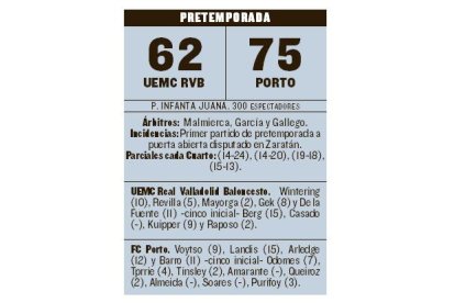 El Real Valladolid Baloncesto inició ayer la ‘era Roberto González’ con una derrota esperada y asumida en el primer guión de pretemporada. El objetivo era competir sabedor de su inferioridad física ante las bajas de hasta cinco jugadores, los dos ‘cincos’ Pippen y Raffington, Pantzar, García-Abril y Puidet. Su rival, el FC Oporto, suponía todo un hueso duro de roer con el aval de haber llegado a Zaratán con una más que cómoda y meritoria victoria debajo del brazo sobre el San Pablo Burgos que daba cuenta de su potencial y de sus intenciones.