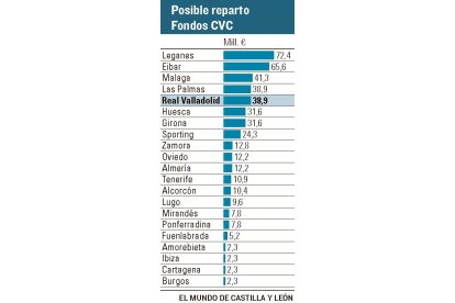 En ese pastel de algo más de 450 millones de euros a repartir entre los clubes de Segunda División, la mayor porción se la llevan el Leganés (72,4) y Éibar (66,6) gracias a una medición en la que se tuvo en cuenta la continuidad en Primera o Segunda división, historial, presupuestos, masa social... En el otro lado del vagón están los recién ascendidos Burgos, Ibiza y Amorebieta, junto al Cartagena, que apenas percibirán por cabeza algo más de 2 millones de euros. Málaga, Las Palmas, Real Valladolid, Huesca y Girona, todos ellos entre 21 y 41 millones de euros, también se sienten beneficiados con un reparto que les ayudará a tener una mente más abierta con proyectos más ambiciosos en sus largamente deseadas ‘cirugías estéticas’.