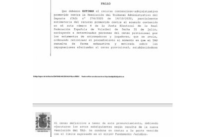 El Juzgado Central Contencioso Administrativo nº11, en procedimiento ordinario 48/2020, sentencia estimar el recurso presentado contra la resolución del TAD en la creación del censo provisional del proceso electoral de la Federación Española y ordena ‘retrotraer el procedimiento al momento en que el TAD resuelva de forma exhaustiva y motivada sobre las impugnaciones efectuadas al censo provisional, estableciéndose el censo definitivo a tenor de este pronunciamiento, debiendo ejecutarse los actos subsiguientes según resulte de la nueva resolución del TAD’. Además, el juez condena en costas a la Administración y a la RFEVB.
