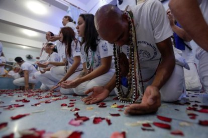 El suelo está cubierto de pétalos de flores y, en las paredes, se cuelgan dibujos y esculturas que rinden homenaje a las divinidades umbandistas, religión practicada por alrededor de medio millón de brasileños, según datos oficiales.