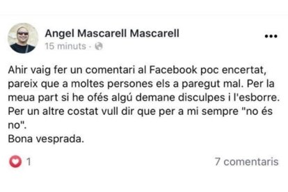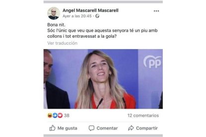 El edil que figuró como independiente en el número cuatro de la lista Gent d'Ador (la candidatura progresista en la que confluyeron socialistas, Compromís y otras sensibilidades y que logró arrebatar al PP la alcaldía ) ha colgado en la red social una fotografía de la dirigente popular con el siguiente texto: "Bona nit. Soc l'únic que veu que aquesta senyora té un piu amb collons i tot entravessat a la gola?".Tras el debate que ha desatado el comentario, Mascarell ha eliminado la publicación de su perfil personal de Facebook y pedido disculpas con un nuevo mensaje en redes sociales en el que ha apuntado: "Ayer hice un comentario en Facebook poco acertado, parece que a muchas personas les ha parecido mal. Por mi parte, si he ofendido a alguien pido disculpas y lo borro". Además, ha proseguido: "Quiero decir que para mí siempre "no es no".
