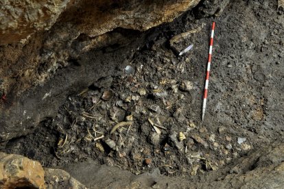Detalle del proceso de excavación en la cueva. Lecho original del fondo de la misma con alta concentración de restos humanos, animales y cerámica