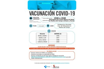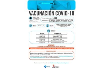 La provincia de Valladolid añade nuevos grupos etarios de la provincia a la campaña de vacunación. La última convocatoria ha sido para los nacidos entre 1944 y 1946, aquellos empadronados en las zonas básicas de salud de Valladolid capital, Laguna, Pisuerga, Valladolid Rural I y Valladolid Rural II. Están convocados entre el 19 y el 22 de abril, es decir, entre el lunes y el jueves de la esta semana.