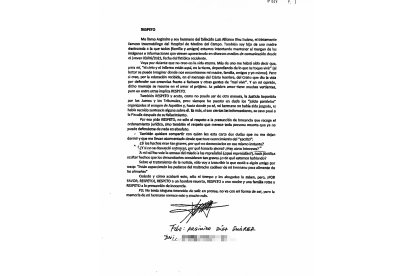 No duda en indicar que lo que están viviendo, su familia y él, es un infierno. «El cielo y el infierno están aquí, en la tierra, dependiendo de lo que te toque vivir y el lector se puede imaginar dónde nos encontramos mi madre, familia, amigos y yo mismo». Por eso, apela a la «educación recibida» y exige «respeto». «Pido respeto –continúa la carta–, no sólo a la presunción de inocencia que recoge el ordenamiento jurídico, sino también el respeto que merece toda persona muerta que no puede defenderse de nada en absoluto».