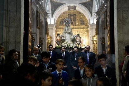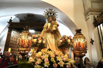 La imagen de la Virgen del Rosarillo es trasladada en procesión hasta el templo tras la celebración de una misa presidida por el obispo emérito de Santander Manuel Sánchez Monge